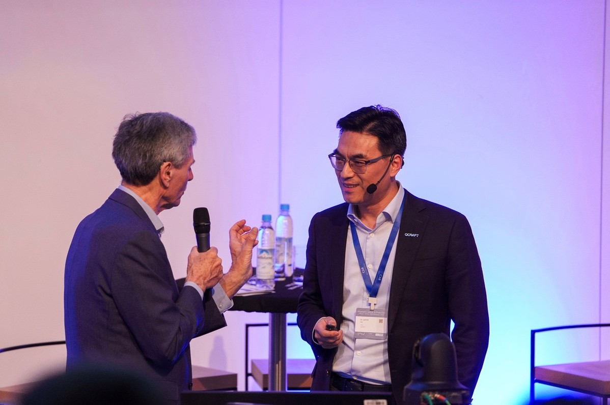 Ю Циан (вдясно), съосновател и главен изпълнителен директор на QCraft, разговаря с Фердинанд Дуденхофер, директор на Центъра за автомобилни изследвания, на индустриален форум в Мюнхен, Германия, на 19 март 2026 г. [Photo provided to chinadaily.com.cn]