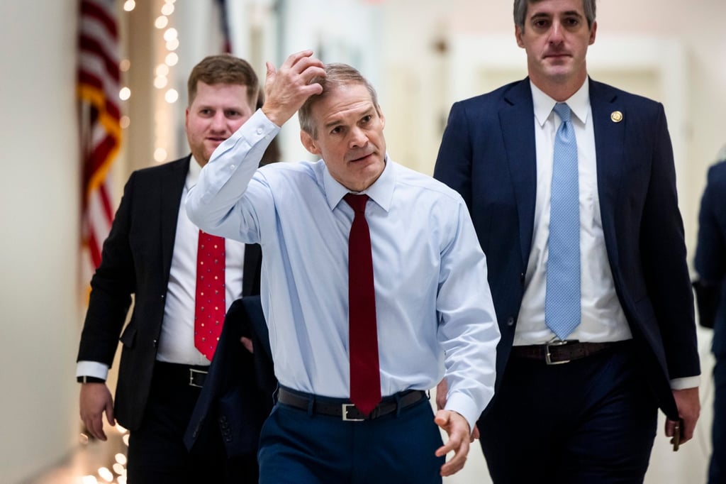 Председателят на правната комисия на Камарата на представителите Джим Джордан (в средата) влиза в показанията на бившия специален прокурор Джак Смит във Вашингтон в сряда. Снимка: EPAПредседателят на правната комисия на Камарата на представителите Джим Джордан (в средата) влиза в показанията на бившия специален прокурор Джак Смит във Вашингтон в сряда. Снимка: EPA