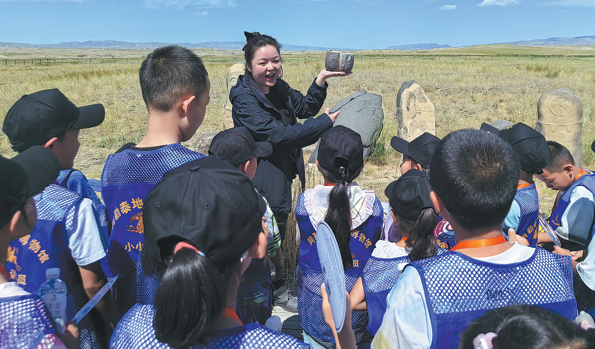 Специалистът по опазване на местното наследство Зоя Бакит (отзад в центъра) дава обяснения на място на място с каменни реликви в град Алтай, автономен регион Синцзян-Уйгур, на 9 юли 2025 г. [Photo provided to China Daily]