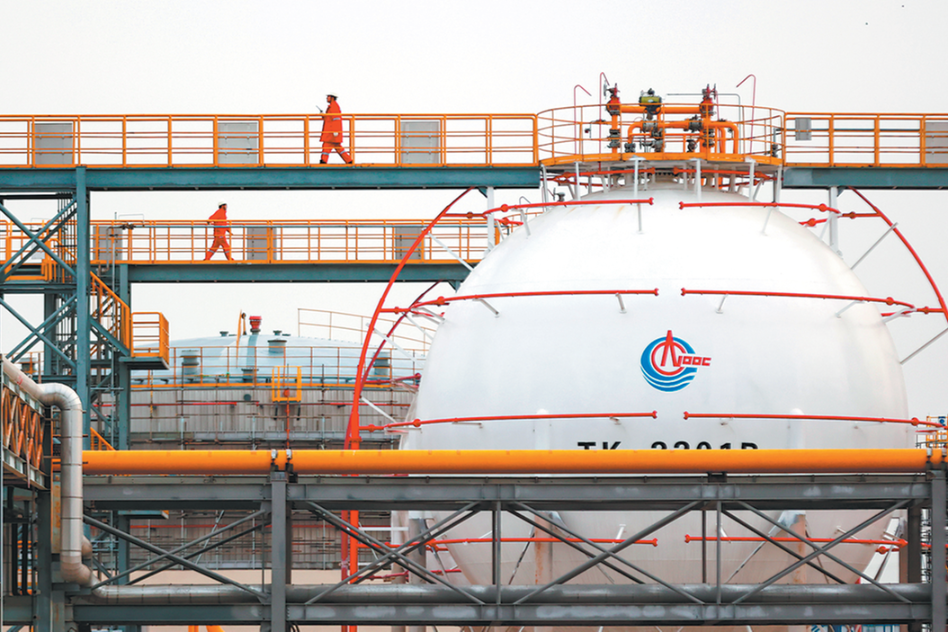 Служителите на CNOOC работят в съоръжение за преработка на нефт и газ в Тиендзин на 1 декември. DU PENGHUI/XINHUA