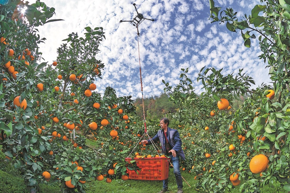 Дрон повдига щайга с портокали в окръг Zigui на Yichang, провинция Hubei. Окръгът е приел интегриран модел на развитие „електронна търговия + верига за доставки + фермер“ през последните години, за да разшири достъпа до пазара за своите характерни плодове и да увеличи доходите на фермерите. Peng Qiang/For China Daily