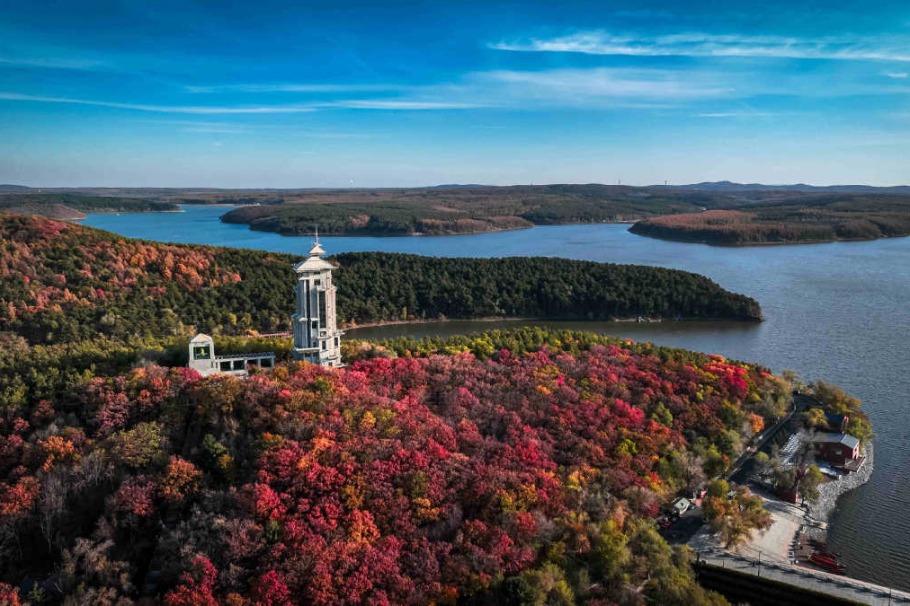 През златната есен на октомври националната живописна зона Jingyuetan в Чанчун, провинция Джилин, се превърна в пастелен рай с листа от зелено, златно, ярко оранжево и наситено червено. [Photo provided to chinadaily.com.cn]