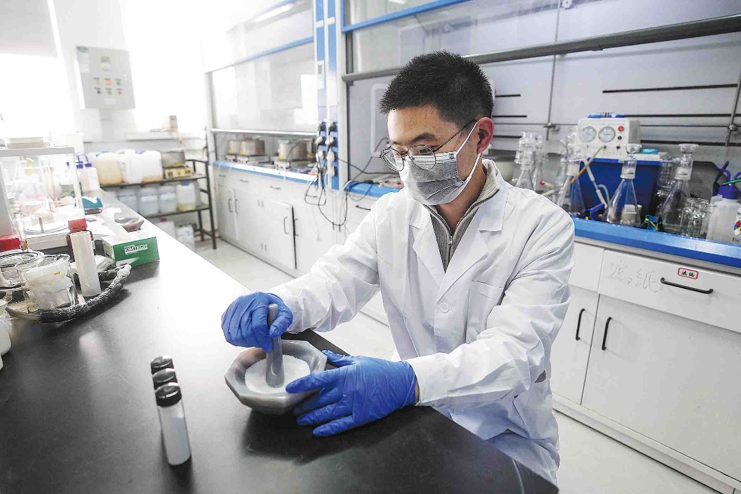 Изследовател смила модифициран полупроводников фотокаталитичен материал в Шенян, провинция Ляонин, 7 април. PAN YULONG/XINHUA