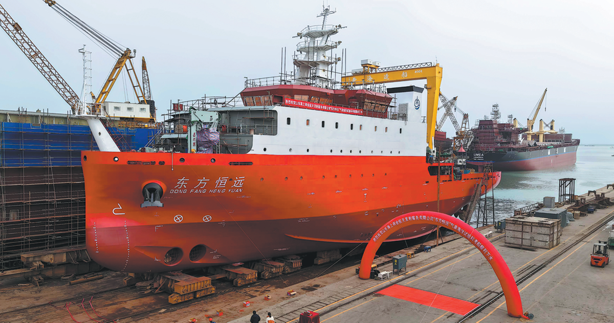 Морският космически кораб за командване и измерване Dongfang Hengyuan е подготвен за изстрелване от сух док на Huanghai Shipbuilding във Weihai, провинция Шандонг, по-рано този месец. [Photo provided to CHINA DAILY]