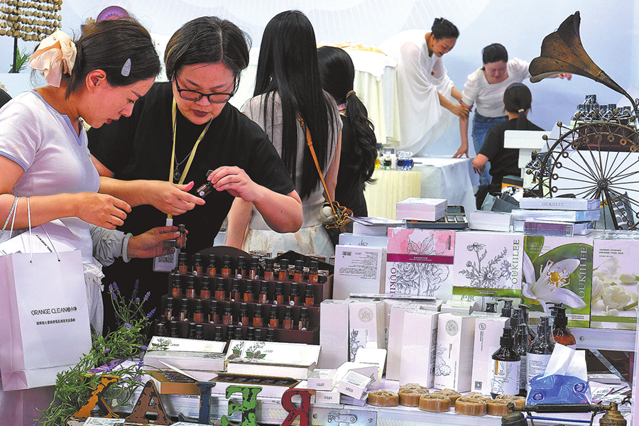 Посетител (вляво) разглежда козметиката по време на 67 -ия Китайско международно изложение за красота на Националния изложба и конгресен център в Шанхай на 25 юни. [Photo provided to China Daily]