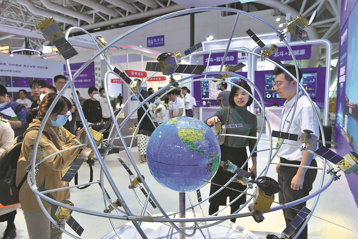 Модел на навигационната спътникова система Beidou е изложен на 6-ата среща на високо равнище за Цифров Китай във Фуджоу, провинция Фуджиан, в четвъртък. [PHOTO/CHINA NEWS SERVICE]