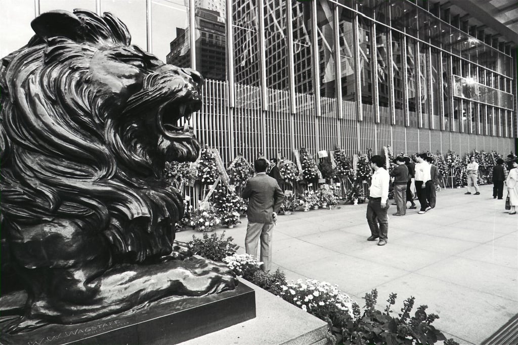 Външен изглед на централата на HSBC по време на церемонията по откриването. Снимка: SCMPВъншен изглед на централата на HSBC по време на церемонията по откриването. Снимка: SCMP