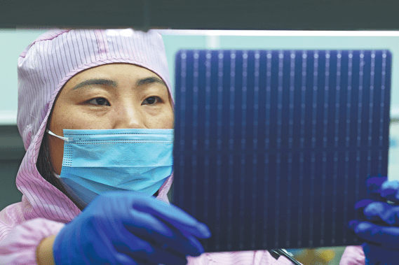 Служител работи на линия за производство на фотоволтаични панели в Maanshan, провинция Anhui, на 21 ноември. WANG YUSHI/ЗА КИТАЙ ДАЙЛИ
