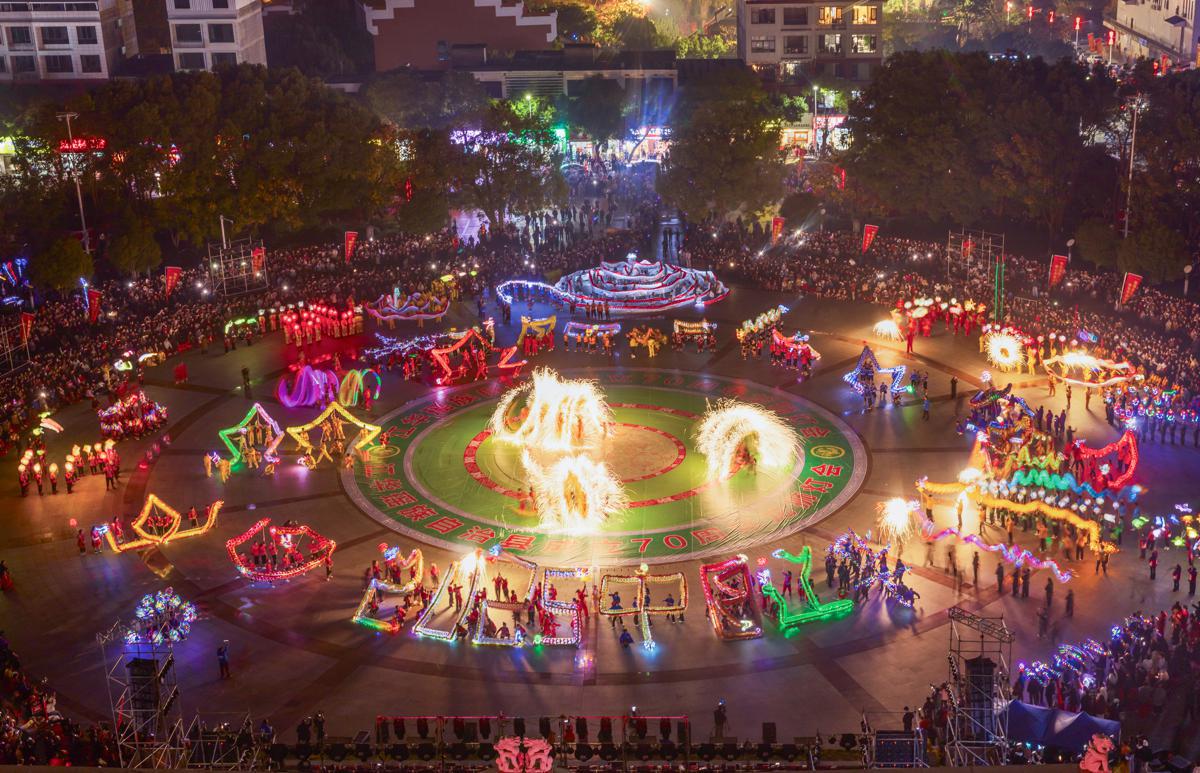 Седемдесет отбора от целия окръг и извън него се събраха на площад в парка в 19:30 часа. Изпълнители на възраст от 9 до 85 г. заслепиха публиката с традиционни фигури на дракони и лъвове, създавайки сложни мотиви под ритъма на барабани и аплодисменти. Сред акцентите бяха впечатляващ 200-метров дракон със 77 секции, представен от екип от село Шенганг, както и многоцветен дракон, маневриран от 1000 изпълнители.