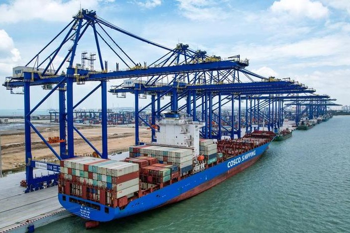 Снимка с дрон, направена на 27 май 2025 г., показва изглед към международното контейнерно пристанище Yangpu в зоната за икономическо развитие Yangpu в Данжоу, провинция Хайнан в Южен Китай. [Photo/Xinhua]