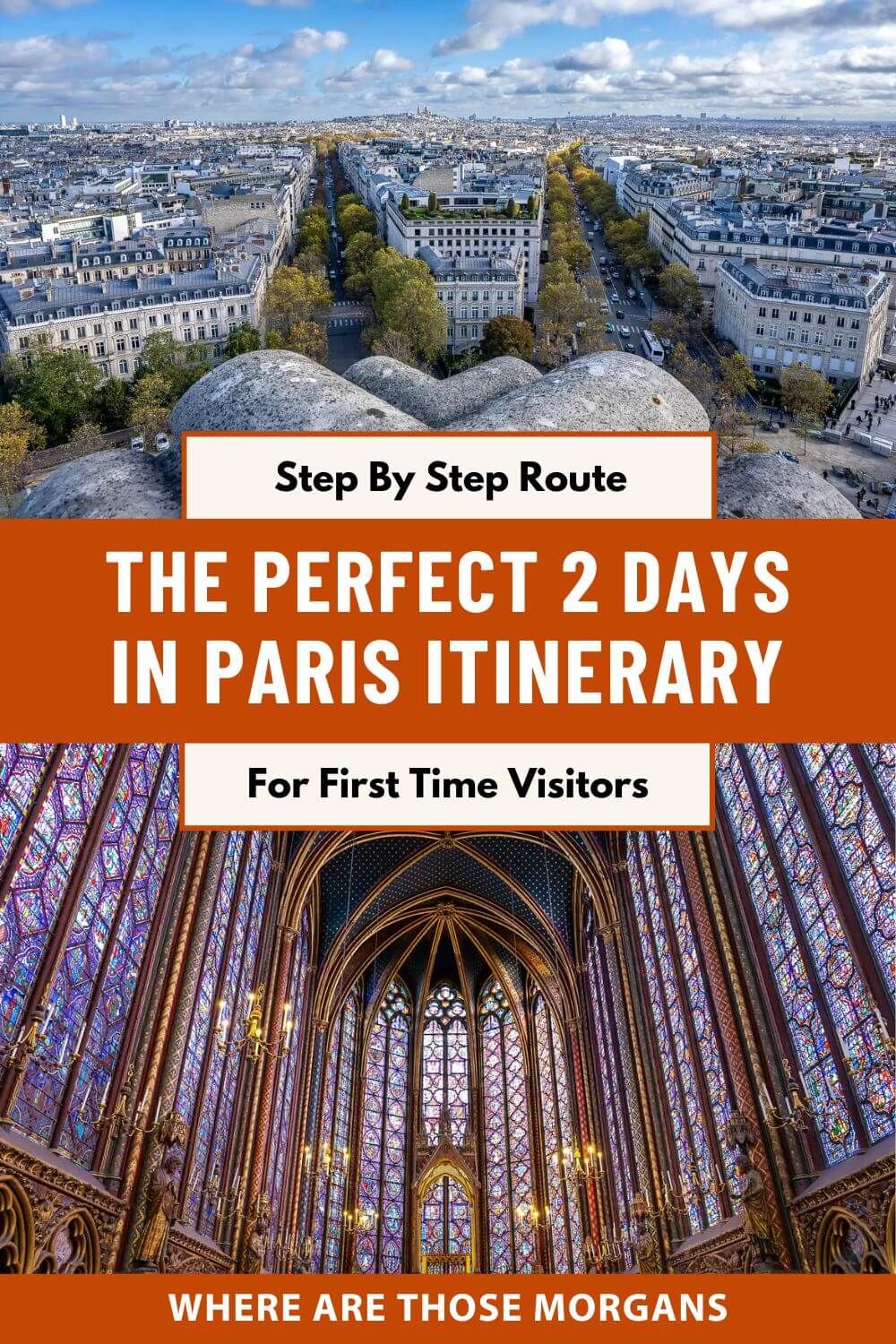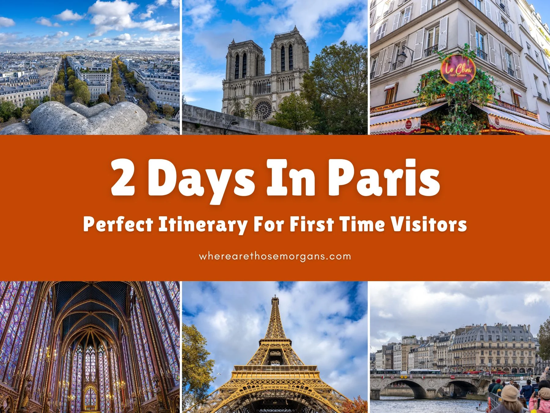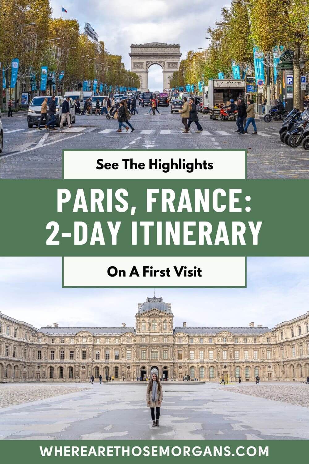Infographic created by Where Are Those Morgans showing an action packed 2 days in Paris itinerary with a summary of attractions on day 1 and 2 morning and afternoon Feel free to save or share our infographic!