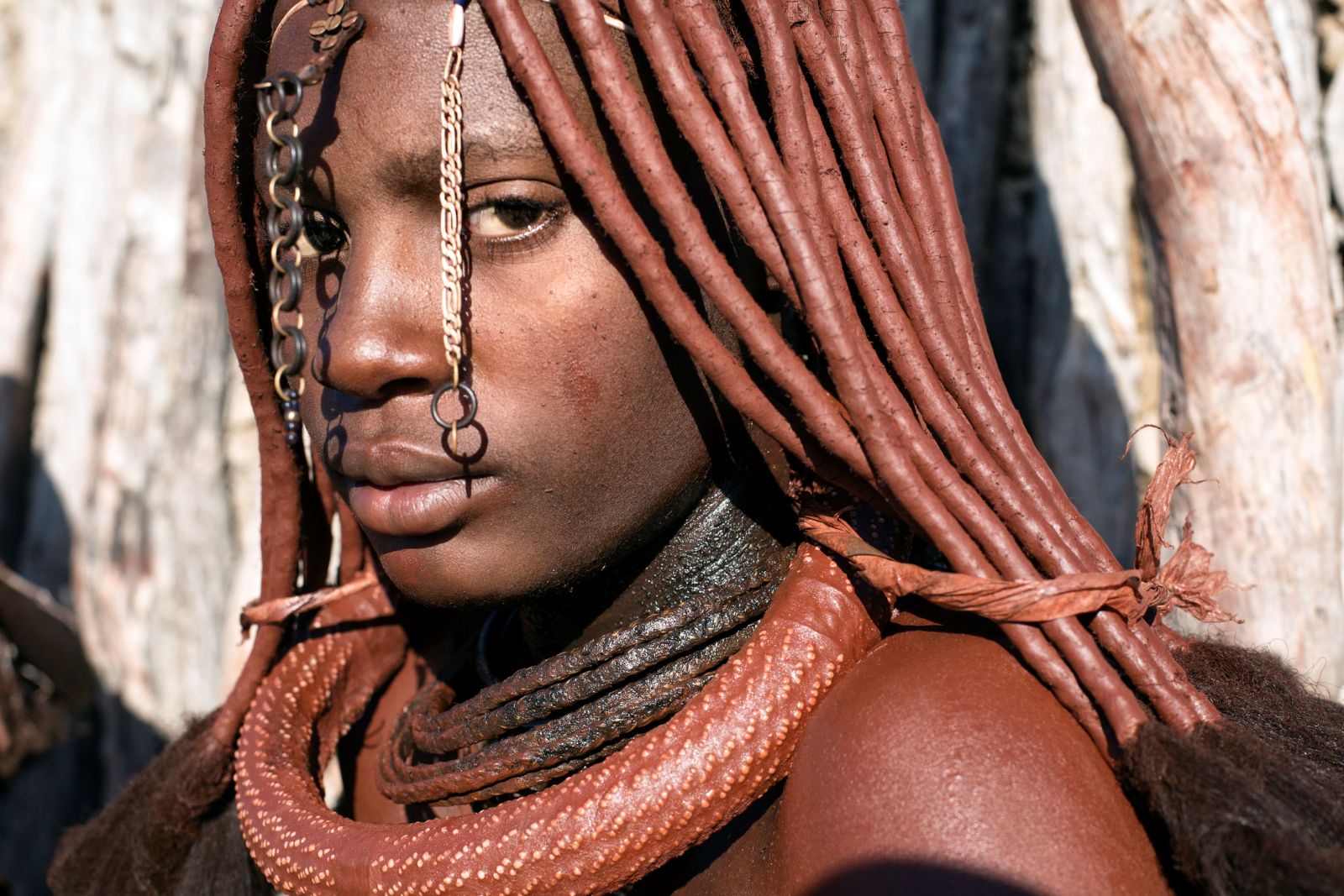 Himba women are well known for their stunning appearance, shaped by both beauty practices and the desert climate. A paste of red ochre is applied to their skin and hair and gives the Himba a deep red color. This protects them from the sun and helps keep them clean in an area where water may be scarce. They have elaborate hairstyles that reflect their age, family status and life stage. They use handmade jewelry, leather adornments, and ornaments as an essential part of their identity.