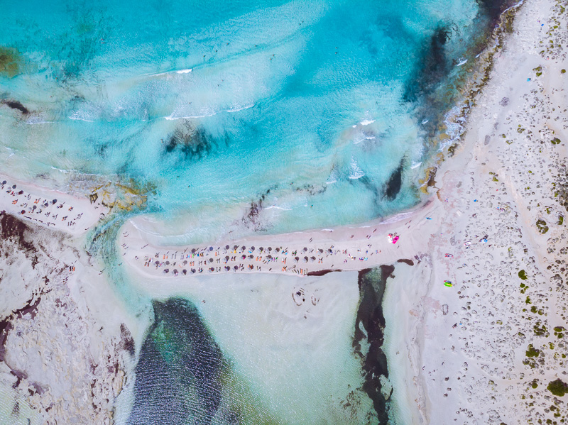The shades of blue of the sea are simply stunning and contrast with the harsh mountainous landscape of the island. Elafonisi is in a rather isolated area, there are a few beach bars where you can get the basics, but it’s always a good idea to pack enough drinks and lunch.